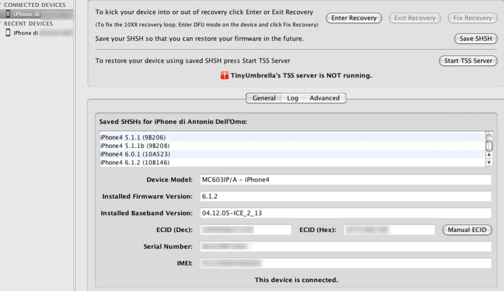 Ora se apro Tinyumbrella, mi esce questa schermata…penso siano stati salvati no? L’shsh del 6.1.2 L’ho salvato da poco quando il telefono era già bloccato sulla mela:comporta qualcosa eventualmente ripristinare da questo shsh??
